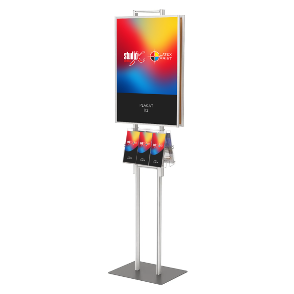 Nowoczesny stojak informacyjny to doskonałe rozwiązanie do biur, recepcji, galerii handlowych, punktów usługowych i przestrzeni wystawienniczych. Dzięki dwóm ramkom na plakaty B1 i dwóm kieszeniom na ulotki A4, A5 lub DL, umożliwia efektywną ekspozycję materiałów promocyjnych.