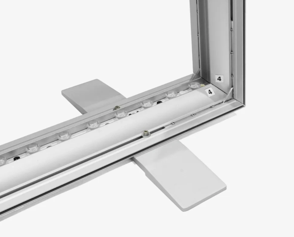 - Montaż kasetonu jest szybki i prosty, polega na połączeniu oznakowanych elementów stelażu i nałożeniu wydruku. Materiał z grafiką jest obszyty gumką, która idealnie opina ramę.