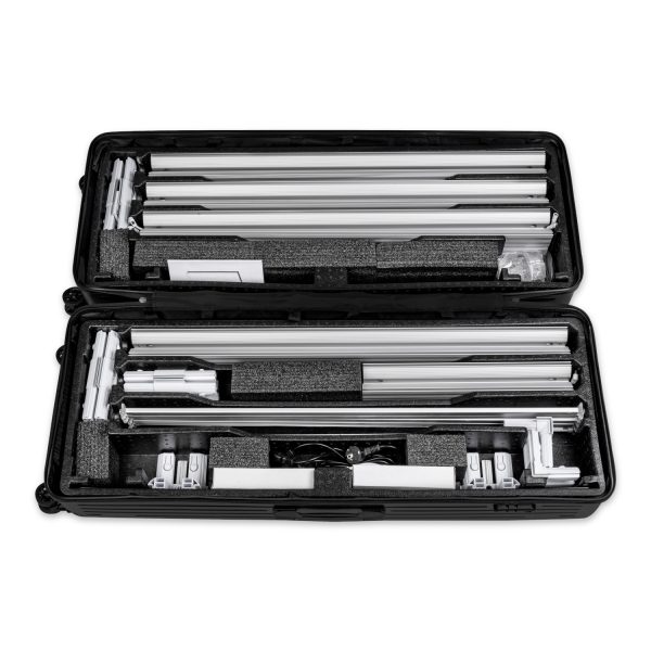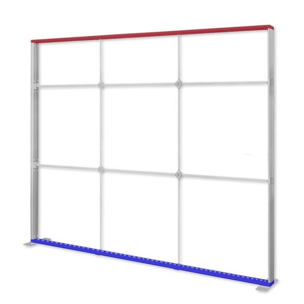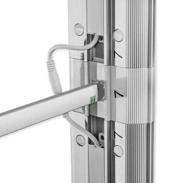 Ścianka wyposażona jest we wbudowane oświetlenie LED OSRAM 6500 K, które równomiernie podświetla grafikę tekstylną mocowaną na silikonowej taśmie SEG. Cały stelaż można złożyć bez użycia narzędzi, co tworzy system idealny dla mobilnych zespołów targowych.