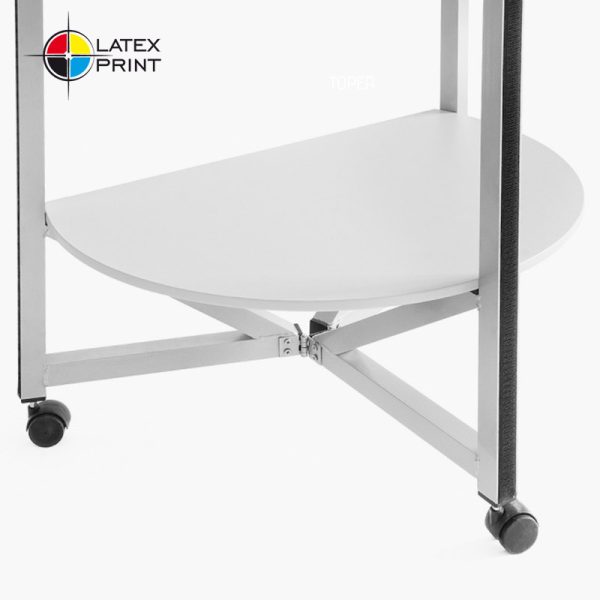 Błyskawiczny montaż, wymienny wydruk i mobilność to jedne z atutów tego stoiska. Mimo swojego kompaktowego wymiaru konstrukcja jest solidna i może unieść około 100kg. Stosowane do produkcji wysokiej jakości materiały oraz rozwiązania techniczne gwarantują wytrzymałość i trwałość produktu.