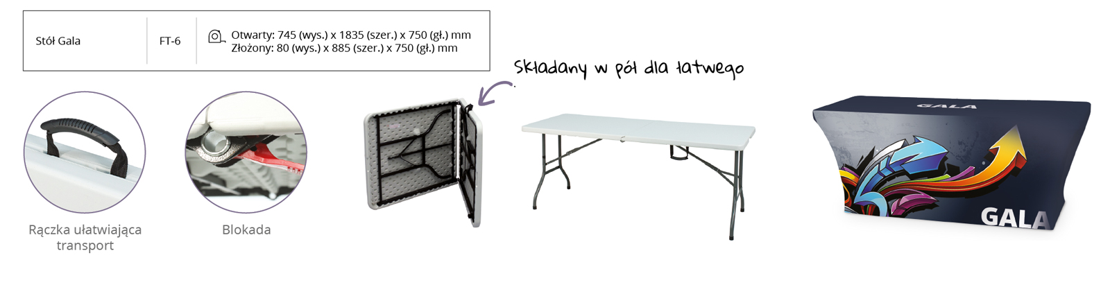 Wytrzymały składany stół, który sprawdzi się na każdej imprezie. Dodatkowo dostępne są dwa rodzaje obrusów – tradycyjny i napinany.