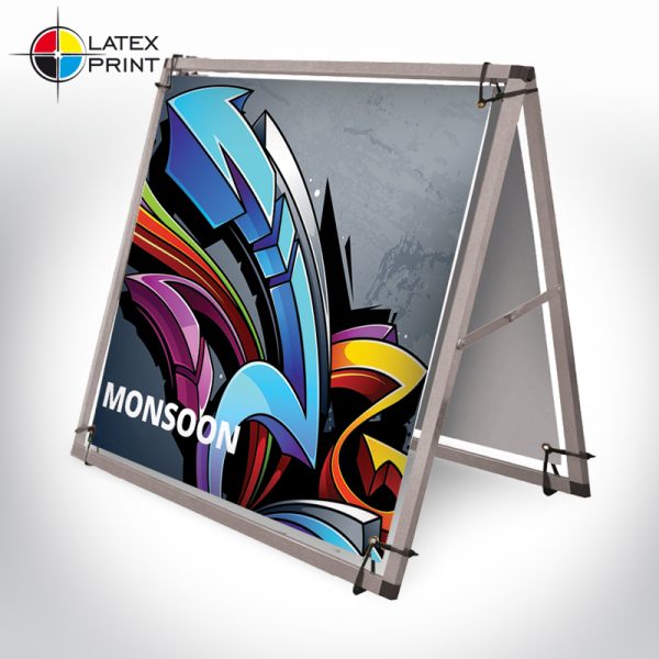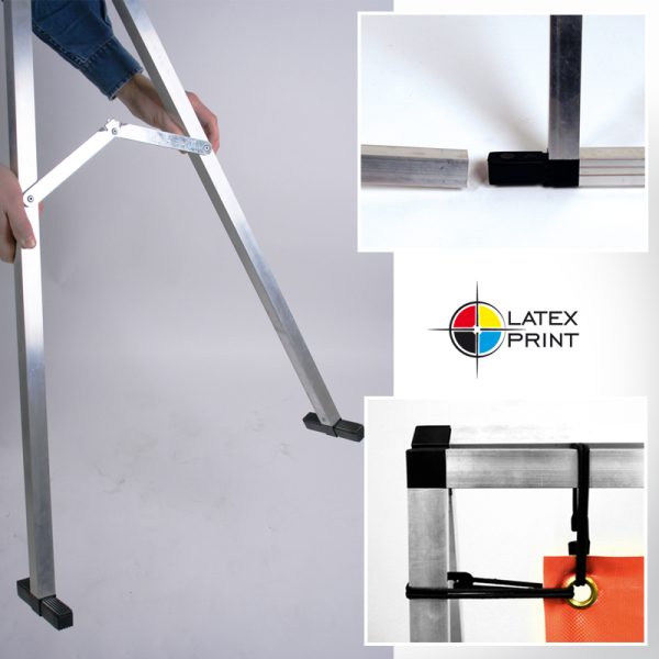 Wielkiego formatu zewnętrzna rama „A”, wykonana z lekkiego aluminium, pod materiał banerowy z wygodnym systemem oczkowym.