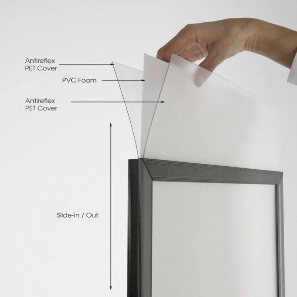 - Rama slide-in: Umożliwia łatwe umiejscowienie plakatów poprzez wsunięcie ich między panel a folię zabezpieczającą.